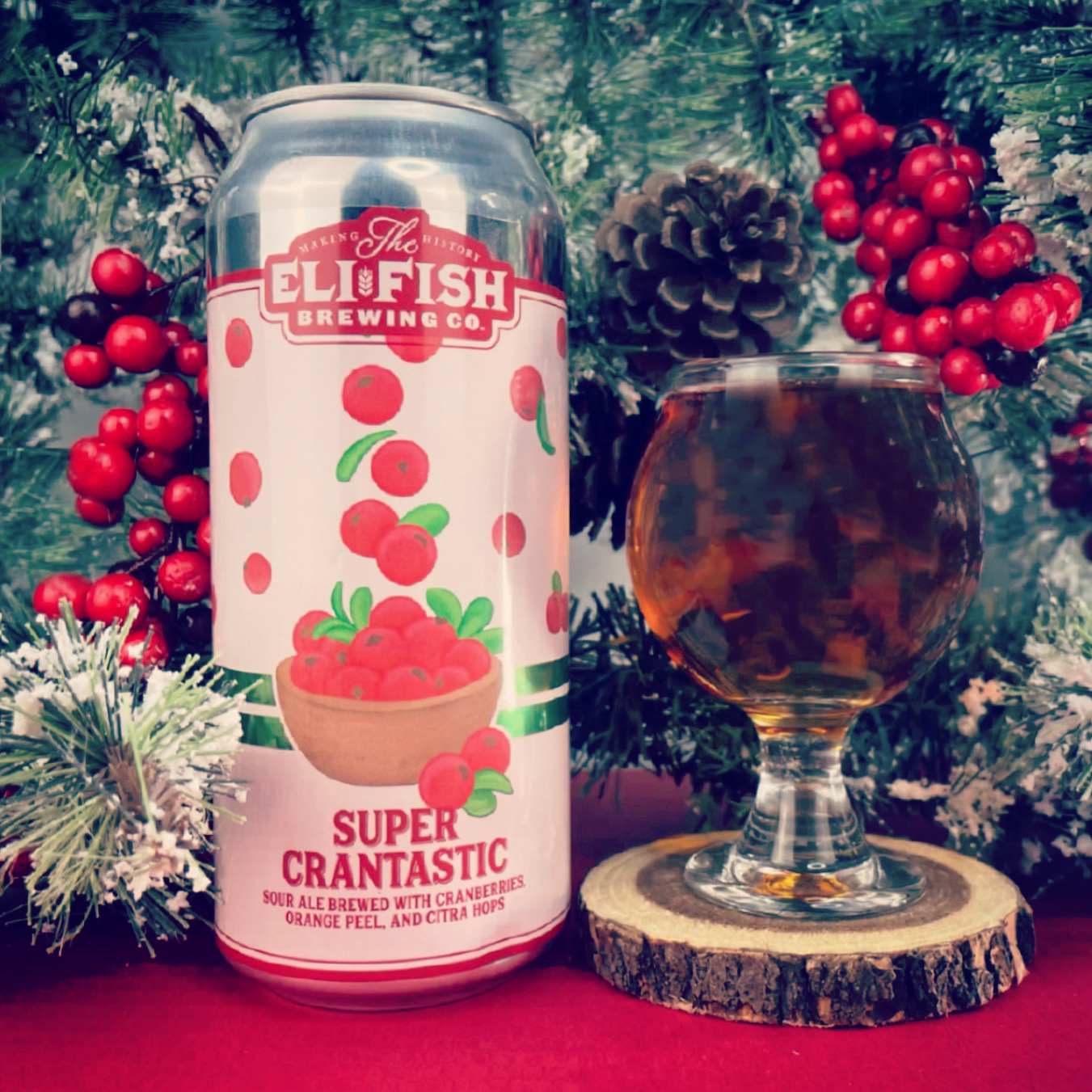 Comments: Day 13 of New York State Beers of Holiday Cheer brings us Super Crantastic, a sour ale from Eli Fish Brewing Co. This sour was brewed with cranberries, orange peel, and Citra hops. It pours a clear dark gold to light brown color; there could even be just a tiny bit of a red or pink tint that gives it that brownish color in the gold. The aroma is strong with cranberry and orange citrus. It has a decent amount of pucker to it, but isn’t overly sour, which allows some sweet cranberry and orange flavors to rule. I’m normally not a huge fan of cranberries, but Super Crantastic’s use of orange really takes everything to a new level and makes it a great sour for the holiday season!